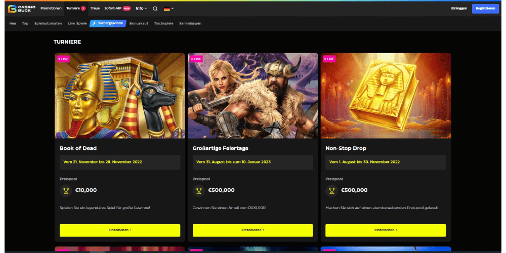 Bei Casinobuck sind die Spiele günstig gelegen und gut organisiert. Der umfangreiche Spielekatalog bei Casinobuck ist vollgepackt mit Spielautomaten, neuen Spielen und beliebten Spielen. Noch mehr Live-Dealer- und Tischspiele sind verfügbar. Nur die besten Spieleentwickler sind bei Casinobuck vertreten, um sicherzustellen, dass Sie das bestmögliche Spielerlebnis erhalten. Unter den zahlreichen bekannten Unternehmen der Branche sind einige Beispiele NetEnt, Elk Studios und Quickspin.