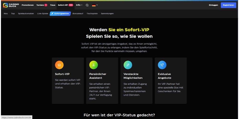 Bei Casinobuck wird Treue belohnt. Dieser Betreiber wird Sie belohnen, solange Sie sich in diesem Casino aufhalten und an den Spielen teilnehmen. Einfach gesagt, je mehr Sie spielen, desto mehr Punkte sammeln Sie. Um die Besonderheiten des Prämienprogramms zu vereinfachen, erhalten Sie 1 Punkt für jeweils 10 € Einsatz. Wenn Sie über eine ausreichende Anzahl verfügen, können Sie diese Punkte gegen Vorteile einlösen. Sie müssen Ihre Statusstufe erhöhen und mehr Prämien sammeln, um sich für sie zu qualifizieren.
