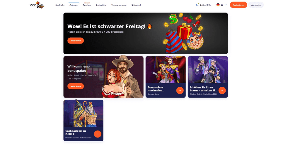Benutzer, die eine große Auswahl an Spielen, hervorragende Boni und eine ästhetisch ansprechende Plattform mit erstklassigen Grafiken und Spieleanbietern genießen, sollten sich das Vulkan Vegas Casino ansehen. Die Plattform hat großzügige Anreize vom Vulkan Vegas Casino erhalten. Sie werden feststellen, dass sie neben dem attraktiven Willkommensangebot zwei Cashback-Aktionen anbieten, eine für alle Mitglieder ihres Treueprogramms und die andere nur für Mitglieder der zehnten Stufe des Treueprogramms, zusätzlich zu einem „Saturday Quest“-Programm Bonus angeboten, der sich aus drei verschiedenen Boni zusammensetzt.