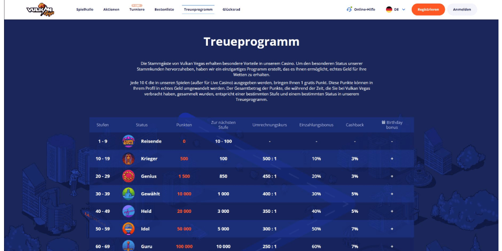 Das Vulkan Vegas Casino tätigt erhebliche Investitionen in die Kundentreue und bietet ein einzigartiges Programm für treue Kunden. Dort haben sie eine liberale Methode zur Vergabe von Punkten. Pro zehn Euro Umsatz erhalten Sie einen Bonuspunkt. Sie können mit diesen Punkten einkaufen, wann immer sie ein Niveau erreichen, auf dem sie eingelöst werden können, z. B. für zusätzliche Geschenke oder echtes Geld. Denken Sie daran, dass der Zeitrahmen für das Einlösen dieser Punkte je nach Ihrem Level und dem Zustand des Treueprogramms variieren kann.