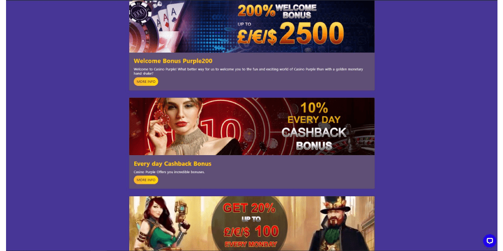 Bei Casino Purple stehen Ihnen eine Vielzahl von Optionen zur Verfügung, um den Spaß beim Spielen Ihrer Lieblingsspiele zu steigern. Die Website bietet eine Vielzahl von Anreizen, und es ist bemerkenswert, dass Casino Purple seine Liste mit Bonuscodes häufig aktualisiert. Natürlich können Sie, sobald Sie sich für das Casino anmelden, von einem tollen Willkommensbonus profitieren, aber das ist noch nicht alles. Sobald Sie sich als treuer Spieler etabliert haben, haben Sie Zugang zu einer Vielzahl von Cashback- und Reload-Anreizen, die Sie die ganze Zeit beschäftigen werden. Außerdem haben Sie die Chance, einige tolle wöchentliche Preise zu gewinnen, die Sie garantiert begeistern werden.