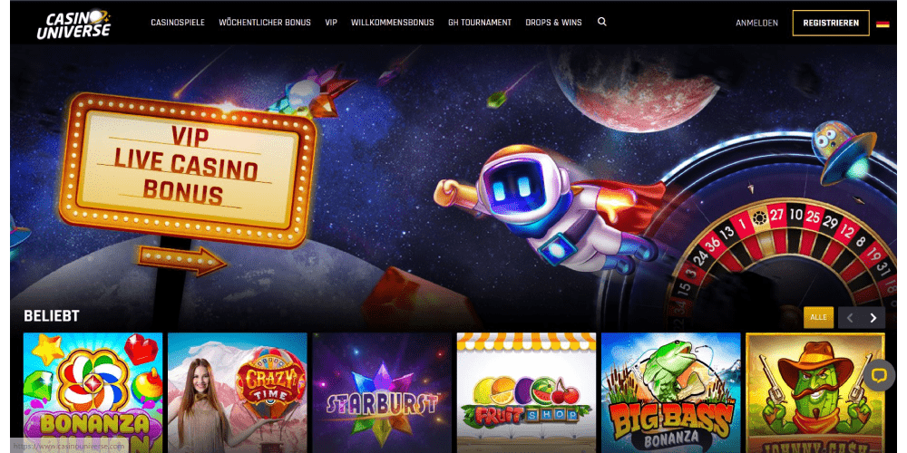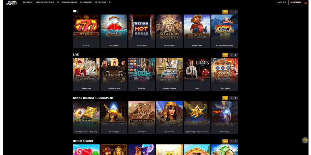 Ein Universum voller fantastischer Spiele ist bei Casino Universe verfügbar, um Sie tagelang zu beschäftigen. Das Casino hat sich mit einigen der besten Softwareentwickler der Branche zusammengetan, darunter Evolution Gaming, Pragmatic Play, NetEnt, Red Tiger Gaming, Thunderkick, Microgaming, Quickspin und Play n Go, um dieses unglaubliche Spielportfolio aufzubauen. Zusätzlich zu dieser perfekten Kombination haben Sie Zugang zu mehreren Incentive-Angeboten, hilfreicher mehrsprachiger Kundenbetreuung und einer Vielzahl von Zahlungsoptionen.