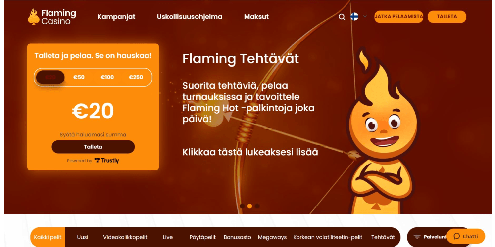 Siinä on kuitenkin pieni saalis: Flaming Casinon tervetuliaisbonus koskee vain alkuperäistä talletusta, eikä sitä jaeta lisäeriin. Siksi, jos haluat koko 1 000 euroa, sinun on ensin talletettava 1 000 euroa oikealla rahalla pelitilillesi. Operaattorit odottavat todennäköisesti, että vain pieni vähemmistö pelaajista ryhtyy tähän toimenpiteeseen. Tämä on epäilemättä syy, miksi he tarjoavat niin suuren summan.