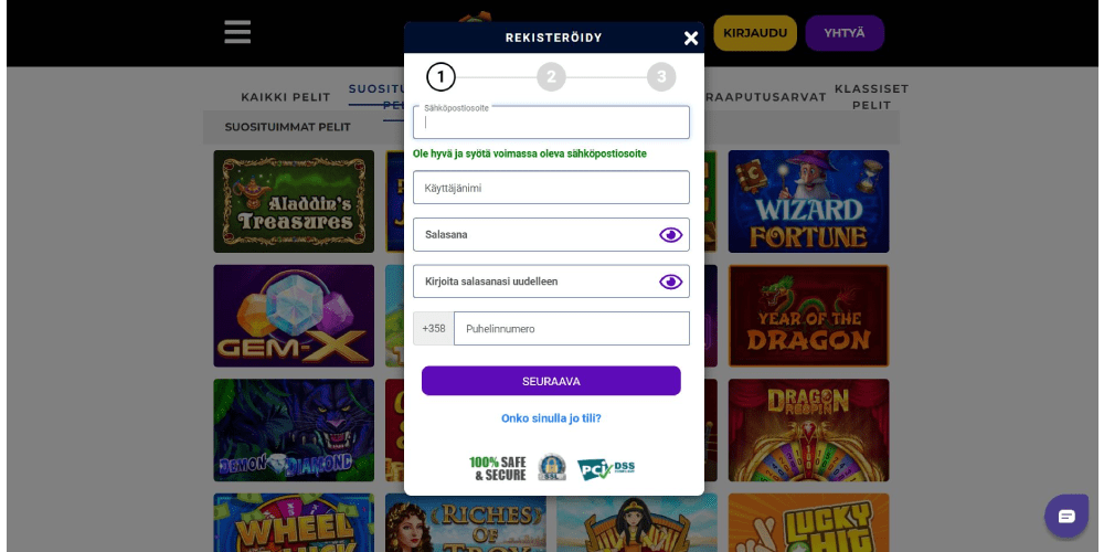 Ehdottomasti! Koska kasino suojaa tietosi SSL-salauksella, voit pelata pelejä ilman riskiä. Lisäksi sillä on Curacaon eGaming-lisenssi.