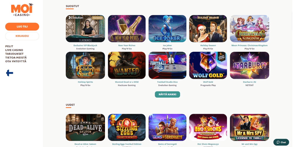 Moi on vuonna 2020 perustettu upouusi nettikasino, jossa on yli 1000 ainutlaatuista peliä. Sen verkkosivusto ei tarjoa mitään erityisen silmiinpistävää sen suhteellisen suoraviivaisen suunnittelun ja valkoisen peruskehyksen vuoksi, joka luettelee pelin tyylilajit. DMG Solutions B.V. omistaa ja ylläpitää kasinoa.