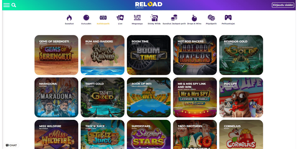 Reload Casinolla on pääsy yli 150 eri kasinopeliin Microgamingilta, ja Mega Moolah toimii pelitelttana ja tarjoaa pelaajille mahdollisuuden voittaa valtavia voittoja. Sama koskee Mermaids Millionsia, Thunderstruck II:ta ja Immortal Romancea. Nämä klassiset nimet ovat edelleen vahvoja nykypäivänä.