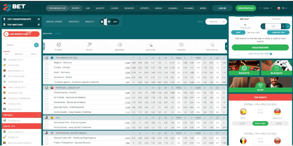 Muligheten til å plassere live-spill mens en begivenhet finner sted er en annen fantastisk funksjon på 22bet.com. Fordi du ikke er begrenset til innsatsene du plasserte før spillets begynnelse, gjør denne funksjonen online sportsspill enda mer spennende. Spillere vil verdsette 22Bets enkle og grunnleggende layout. Den enkle utformingen av 22Bet gjennom hele evalueringen gjorde det enkelt å lage og oppdatere spill, selv for nybegynnere. Til venstre er en liste over alle idrettene som er tilgjengelige, og i midten er det informasjon om arrangementene. De har også tidsrammefiltre, som kan brukes til å begrense alternativene dine. Selv om du aldri har gamblet på sport før, vil 22Bet gjøre det enkelt å gjøre det.
