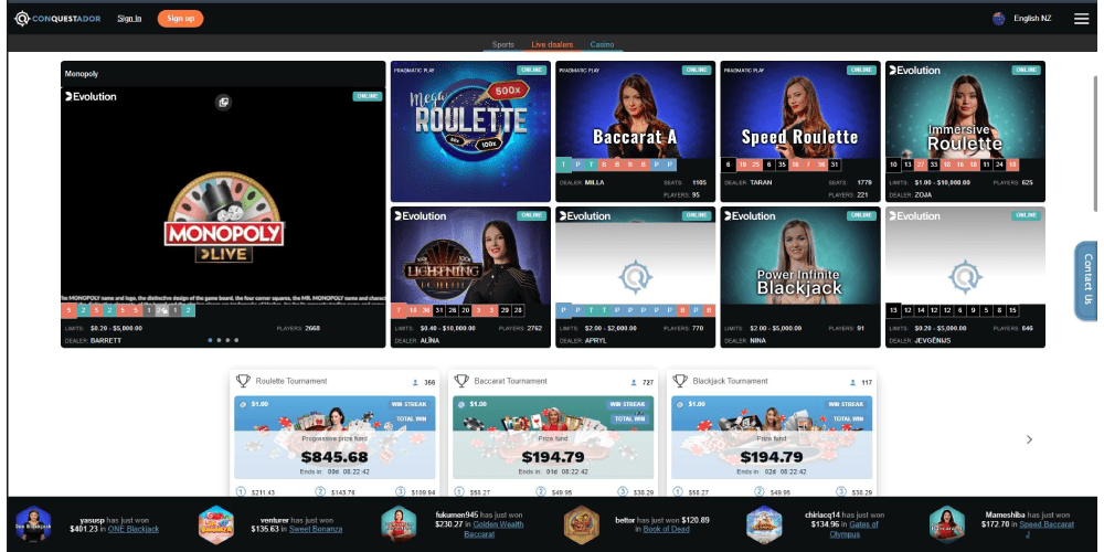 The Conquestador website has a section devoted to live casino games, and there are 20 distinct alternatives available. In addition to the standard favourites like American Roulette and Free Bet Blackjack, there is now the opportunity to play games designed after game shows. Additionally, you may participate in a blackjack tournament or a baccarat tournament to compete against other players for rewards.