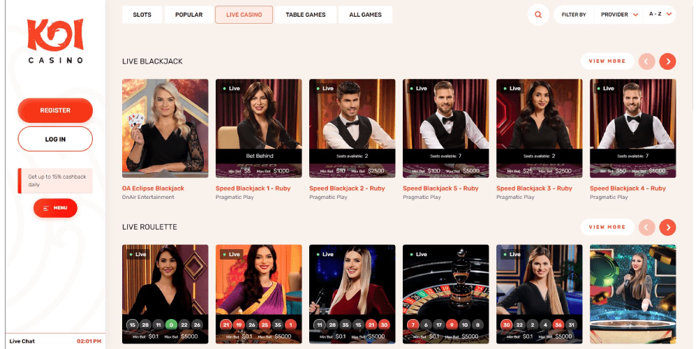 A vast collection of thousands of titles may be found in the library at Koi Casino. On the website, you may play video poker, blackjack, and several of the most well-known video slots. While there are many slots available, there are just two virtual table games available, making the options rather limited. Fortunately, the extensive collection is equally simple to explore because to the abundance of search and filter options. This implies that you will locate or learn about your favourite games rapidly. Virtual games also include free-to-play trial versions so you may give them a try before placing real money wagers. Additionally, Koi offers a section devoted to live casinos. There are seven separate lobby areas inside, each with dealers for the games Crazy Time, Dragon Tiger, and Roulette.